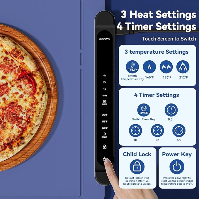 - Child Lock & Safety Features: Thoughtfully designed for safety, ZCJSHX food warmer mat for parties includes a convenient child lock that activates automatically after 10 seconds of inactivity, preventing unintended operation. An internal temperature control switch protects the unit from overheating, ensuring durability. For added safety, the default startup temperature is set to 140℉/60℃, and the device automatically shuts off after 3 hours of inactivity (or follows the set timer).