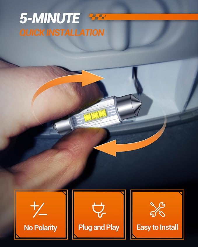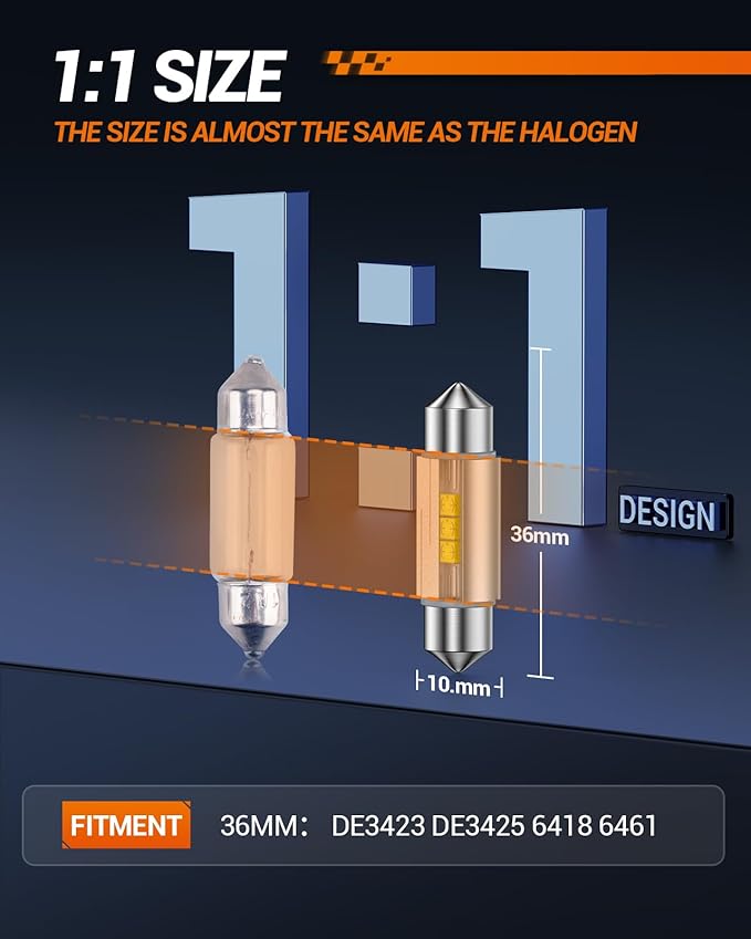 - 400% BRIGHTER: These led dome light bulbs emit a bright and neat light that is soft and not harsh, with no flickering issues. Our DE3423 interior led lights are 400% brighter than halogen bulbs and can illuminate every corner of your car, creating a neat and comfortable space for you.