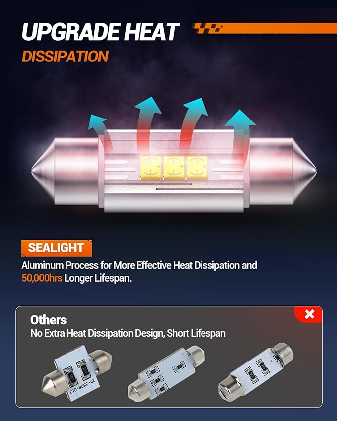 - High Quality LED Bulb: SEALIGHT 36mm DE3423 LED bulb adopts the latest 2525 high temperature resistant ceramic chipset, which is characterized by high temperature resistance, high mechanical strength and low dielectric loss. This means that our LED bulbs are more stable, effectively extending the lifespan of the bulb up to 50,000 hours.