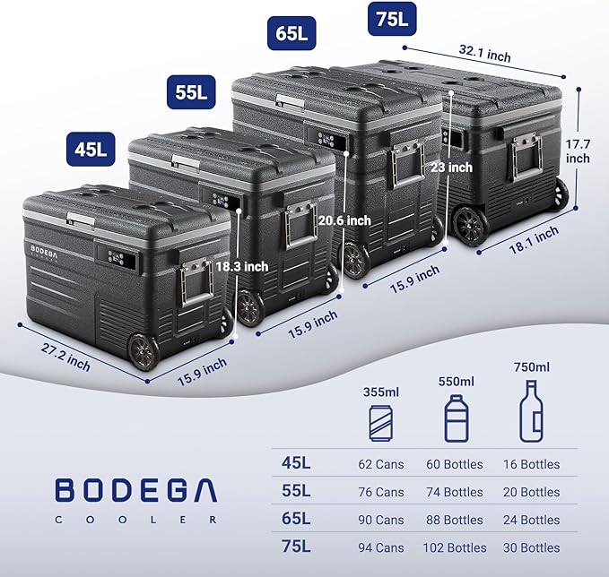- 【55L Large Capacity】BODEGACOOLER 12v car refrigerator has a 55L large capacity,you can cool drinks,seafood,snacks,meat,beverages,etc at the same time.This single zone car refrigerator is best choice for camping,party,boating,fishing,outdoor and travel and fully meets RV or truck drivers,boat owners and campers needs.