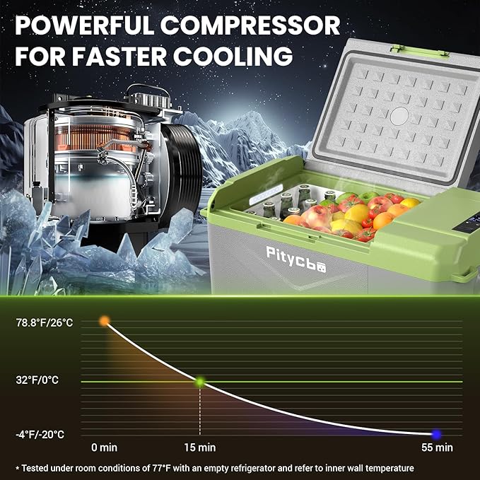 - Smart Extreme Cooling: Farewell to the trouble of temperature adjustment, Pitycbo car freezer can easily control the temperature by APP, with a wide range of adjustments from -4°F to 68°F, to keep the ingredients as fresh as ever, avoiding over-freezing or spoilage, and the Max Mode is a 15-minute quick cooling down to 32°F, which is not afraid of the heat, and locks in the nutrients. Every journey, let the flavor and health go with you!