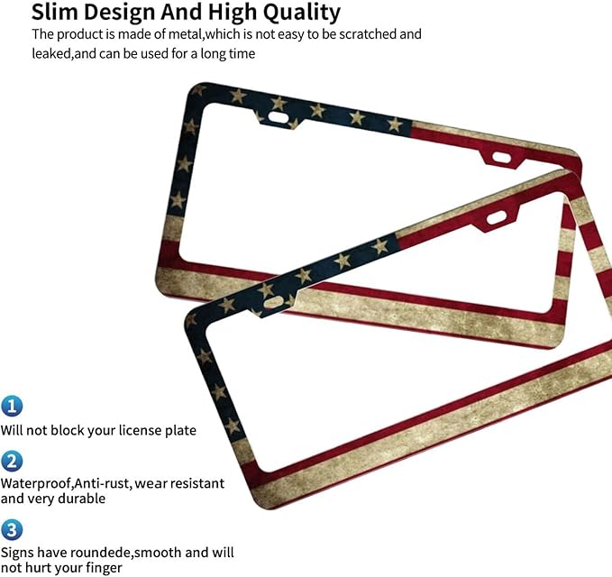 - Package Content: You Can Get 2 Pieces Aluminum Decorative license plate frame flag In Total, 1 license plate cover flag in Front And 2 license cover american in Back, Screw Fittings Included; The Complete Combination Makes Our Car Different From Others, The frames for car license plates american flag Are Also A Nice Gift For Those Who Like To Decorate Cars At The Same Time