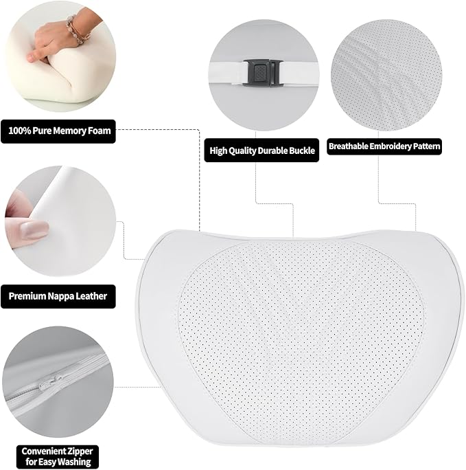 Car Neck Pillow Memory Foam Premium Leather Headrest Neck Support Cushion Universal for Driving Home Office, White,1PC