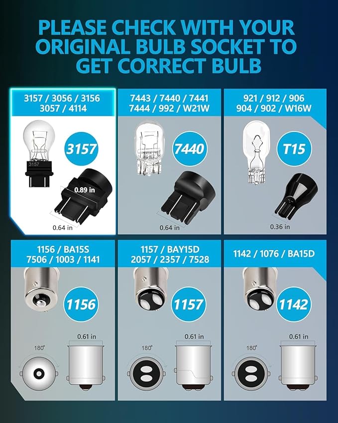 - 【FITMENT】- Fit for 3157, 3056, 3156, 3047, 3057, 3457, 4057, 4114, 4157, 3156NA, 3156A, 3057A, 3157A, 3157NA, 3457A, 3457K, 3457NA, 4157NA, 5702 ect, replacement for Brake Lights, Turn Signal Lights, Reverse Back Up Lights, Tail Lights, Parking Lights, Side Marker Lights, Daytime Running Lights etc. A 50w Load resistor might be needed to prevent error message when replace for Turn Signal Lights. You may also need a flasher relay to solve the fast blinker issue for some vehicles