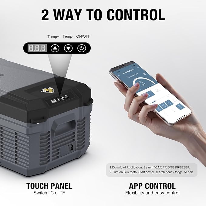 - TOUCH PANEL & APP CONTROL: Easily control your 12V portable refrigerator with the touch panel or remotely via Bluetooth app. Featuring a temperature memory function, this car fridge is perfect for camping, road trips, or daily use. For setup and usage tips, please refer to the included manual.