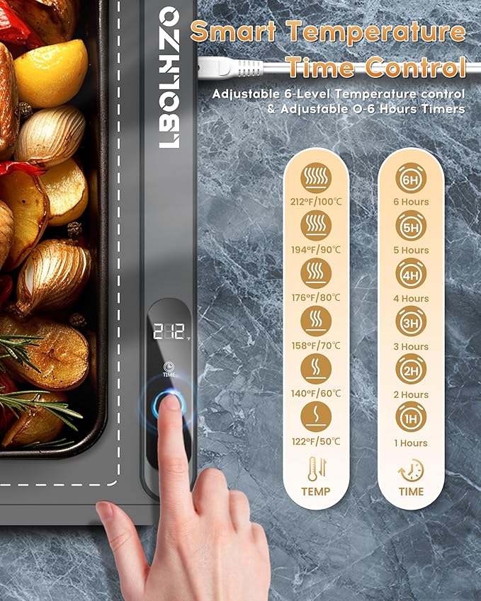 - 【Adjustable 6-Level Temperature Food Warmer】 Elevate your dining experience with our versatile warming mat for food,featuring auto shut-off warming tray settings ranging from 6 temperature levels from 122 °F to 212 °F.Keep your food warming mat at the perfect serving temperature with ease.Tip: When using a food warming mat, cover the dishes with a lid for faster heating and improve heat retention.
