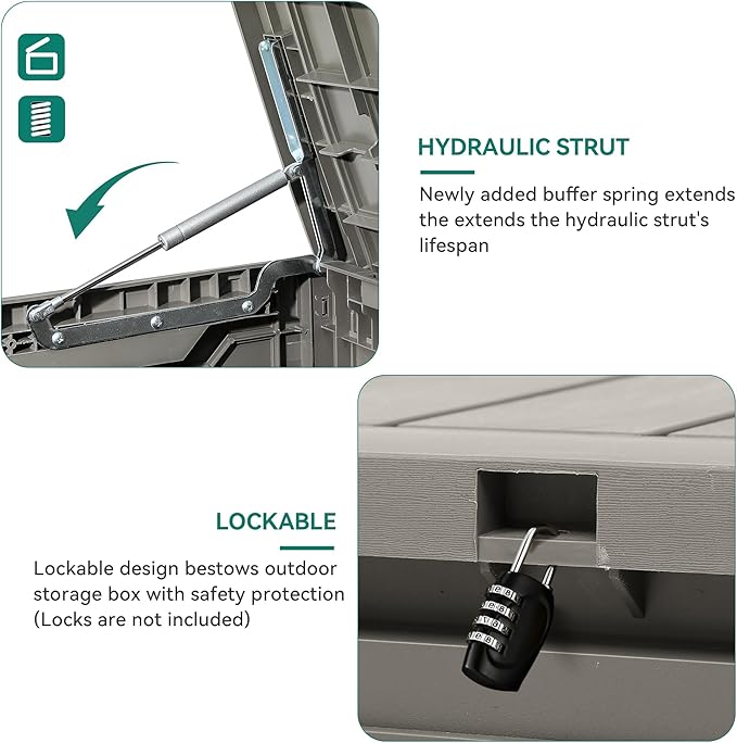 - Convenient Design: The resin outdoor storage features hydraulic struts for smooth, slow, and safe opening and closing, with dual side handles for effortless movement, whether by yourself or with a friend