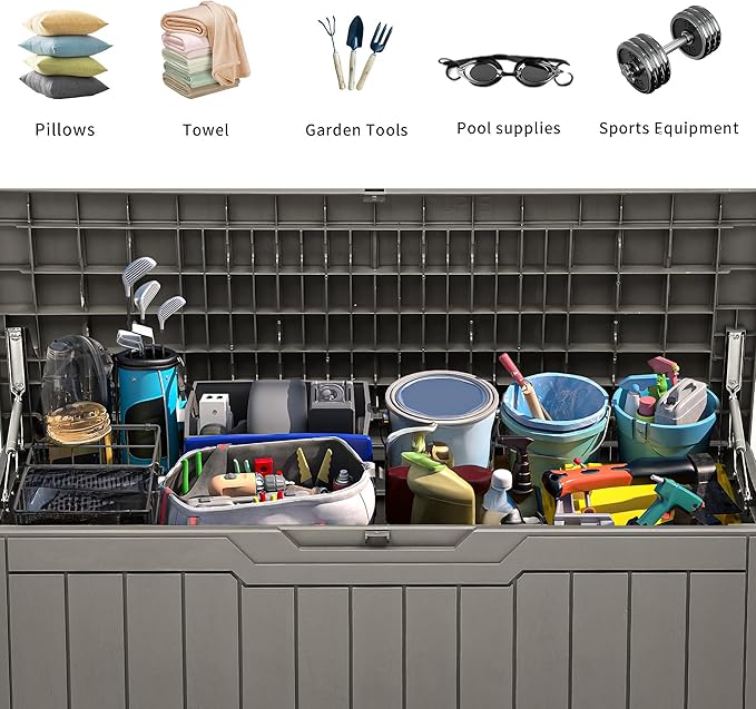 - Versatile and Secure: Our resin storage box is designed for both indoor or outdoor use, suitable for storing patio furniture cushions, gardening tools, pool accessories, and more; The deck box with lock design ensures your items stay safe and secure