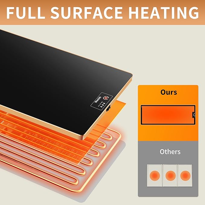 - Daily Convenience - ①Tempered glass surface of electric food warmers is explosion-proof, waterproof and oil-proof, easy to clean, tough and durable. ②When using the heating mat for food, the 78-inch non-removable power cord does not limit the use of space. ③The electric tray warmers for serving food is easy to store, slim body design, can be placed flat or vertically against the wall/corner, can also be put back to the original packaging carton for storage.