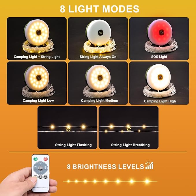 - 8 Lighting Modes + 8 Brightness Levels: Our outdoor string light has 8 different light modes which can be remote controlled - 1) string lights on 2)string lights quick flash 3)string lights slow flash 4) strong camping light 5) medium camping light 6) soft camping light 7) string light + camping light 8) SOS light - providing the perfect ambience for every scenario. The lights are also dimmable with 8 brightness levels that can be adjusted using the remote.