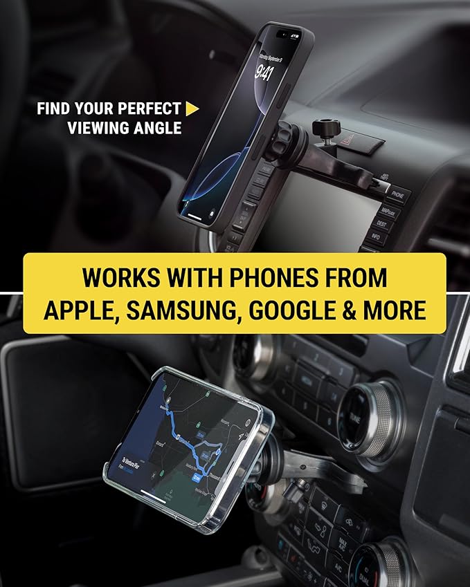 - Hassle-Free Installation: Slide our CD player phone holder for car into place and enjoy the drive—no adhesives, vent clips, or clutter. Designed to keep your dashboard clear, your airflow unobstructed, with the flexibility to switch this MagSafe mount between vehicles