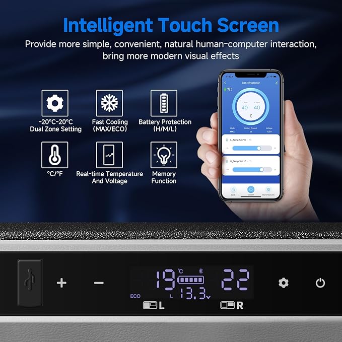 - Special Feature : APP control (For Android/IOS), also can manual control; Dual Zone temp independent control; -4℉(-20℃)-68℉(20℃) Setting; Wheels,retractable handle,Inside Led Light Design; Battery Protection H/M/L,Max/Eco Cooling Choice; Support 12/24V DC and 100-240V AC; 2 Detachable Doors APP control (For Android/IOS), also can manual control; Dual Zone temp independent control; -4℉(-20℃)-68℉(20℃) Setting; Wheels,retractable ha… See more