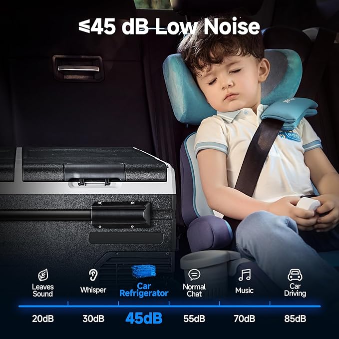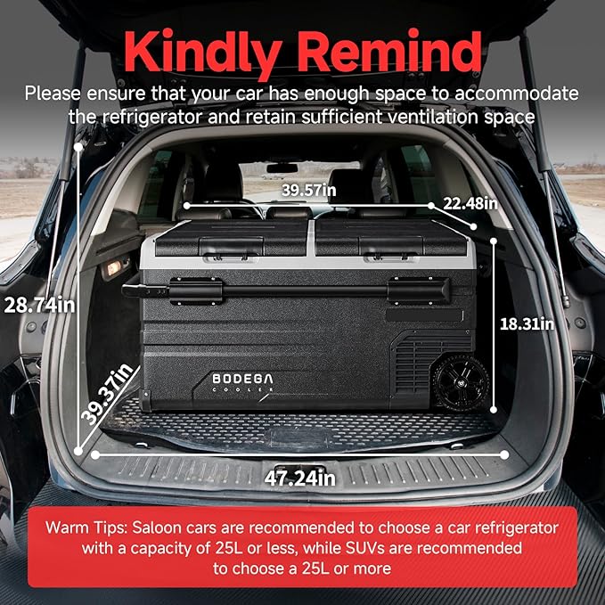 - ANTI-SHAKING: BODEGACOOLER 12v fridge provides a silent and comfortable environment for you.Because of its overall external smooth lines and equipped with a multi-functional non-slip base, the lateral displacement is greatly reduced. When your car is climbing at an inclination angle of 30 degrees, the car portable freezer can still run stably.Our portable car refrigerator allows you to enjoy cold drinks in stable and quiet during the trip