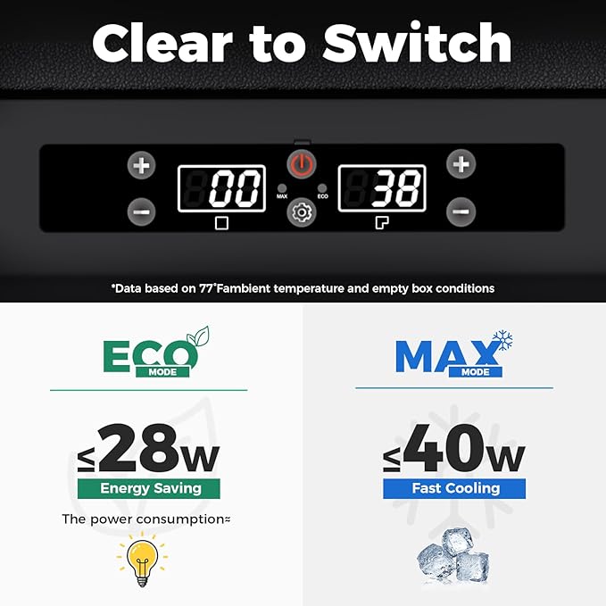 - Low Power Consumption: MAX and ECO cooling modes are optional in the Setpower portable refrigerator, consuming less than 28W in ECO mode and less than 40W in MAX mode.Less than 1kWh/day,save more money.You can run this 12 volt cooler not only 12/24V DC power,but also 120/240 AC