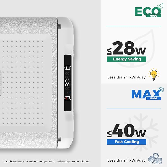 - Save Energy and Money: With the Smartele refrigeration technology, this 12v coolers for vehicles can quickly cool from 68℉ to 32℉ in 15 mins and 45 min from 68℉ to -4℉.To choose ECO or Max mode that you need,this portable electric cooler consumes only 28W in ECO mode and 40W in MAX mode— less than 1 kWh a day