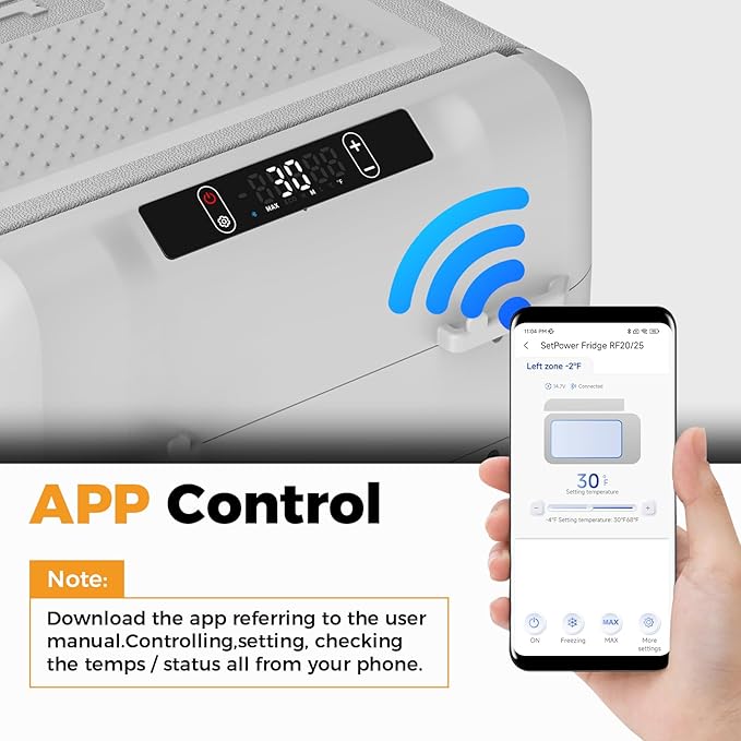 - APP Control and Led Display: You can switch between modes of the truck fridge with the control panel or remotely via your phone. The Setpower RF25 12V cooler that doubles as a protable fridge or freezer. (Temp. Range from 68 ℉ to -4 ℉)