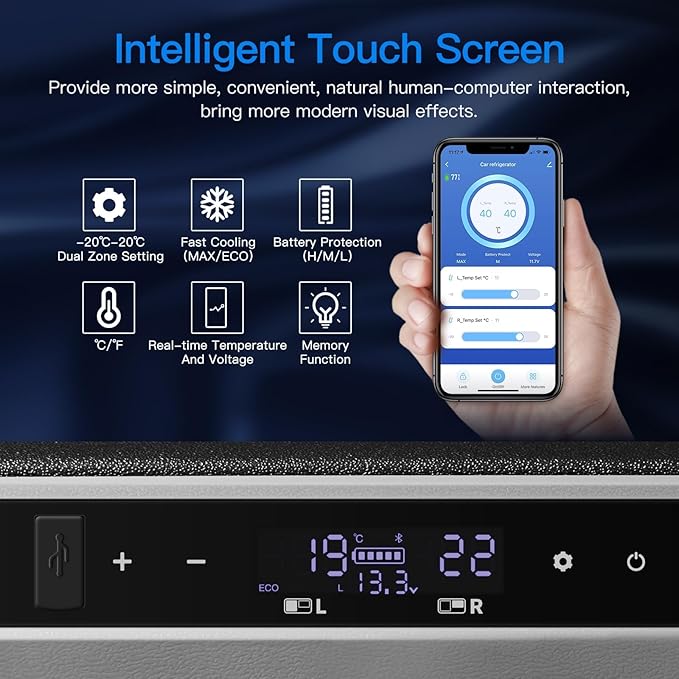 - Special Feature : APP control (For Android/IOS), also can manual control,Dual Zone temp independent control,-4℉(-20℃)-68℉(20℃) Setting, handle,Inside Led Light Design,Battery Protection H/M/L,Max/Eco Cooling Choice,Battery can be installed (but not included),Support 12/24V DC and 100-240V AC APP control (For Android/IOS), also can manual control,Dual Zone temp independent control,-4℉(-20℃)-68℉(20℃) Setting, handle,Inside Led Lig… See more