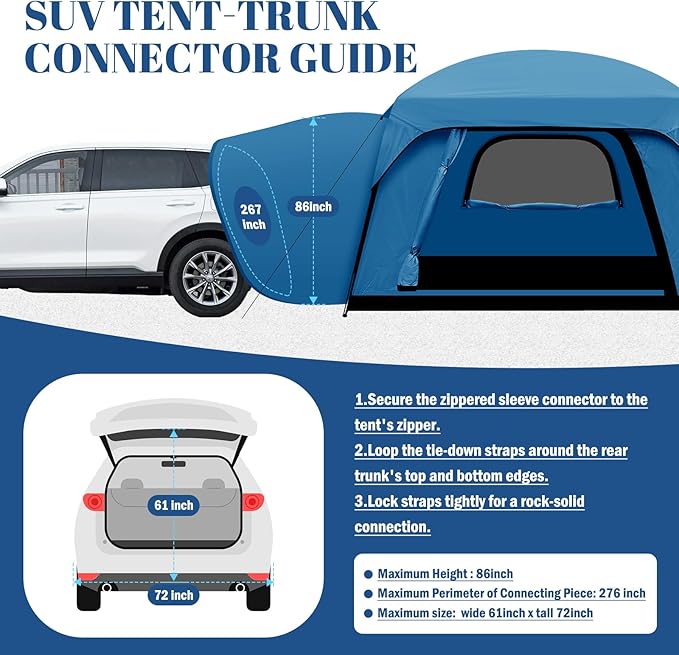 - 3-Step Quick Connect SUV Attachment:Setting up camp has never been easier. Secure the zippered sleeve to your tent, loop the Tire Tie-Down Straps around your vehicle’s trunk edges, and lock them tight with the ratchet buckles. The suction cups add extra stability to window panels without scratching your car’s paint—no tools or expertise required.