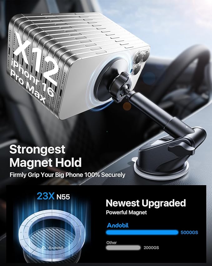 - [Exceptionally Strong Magnetic Force] Experience unparalleled stability with our magnetic car phone mount, engineered with 20 larger and more powerful N55 permanent magnets. This design guarantees an ultra-strong suction power, ensuring your phone remains securely in position even during bumpy rides. The annular closed magnetic field of our magnetic car phone holder eliminates signal interference, allowing seamless navigation and uninterrupted calling. Upgrade to our premium magnetic phone holder for a secure and reliable driving experience on any road conditions.
