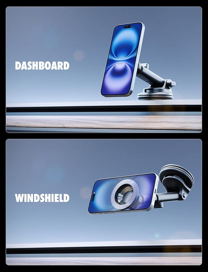 - 【Stronger Suction Cup】This magnetic phone car mount has extreme magnetic hold with suction and designed for maximum device security.