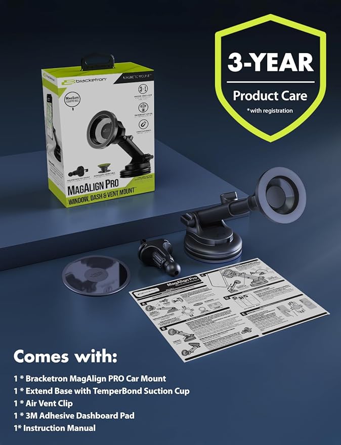 Bracketron MagSafe Car Mount,MagAlign Pro Extend Magnetic Phone Holder for Car Windshield & Dashboard & Vent,360° Vacuum Suction Cup Phone Mount for iPhone 16 Pro Max 15 14 13 12,Car Accessories.