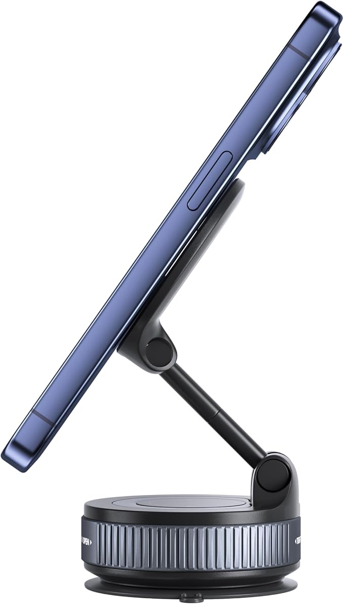 - Easy to install:Installs in seconds! Simply press the vacuum base on any smooth surface (dashboard/windshield), twist the lock knob to activate ultra-strong suction. The powerful magnet holds your phone firmly—even on bumpy roads.(gift 1. The magnet ring-can be pasted on the back case of your phone, gift 2. sleek base to facilitate your sticking)