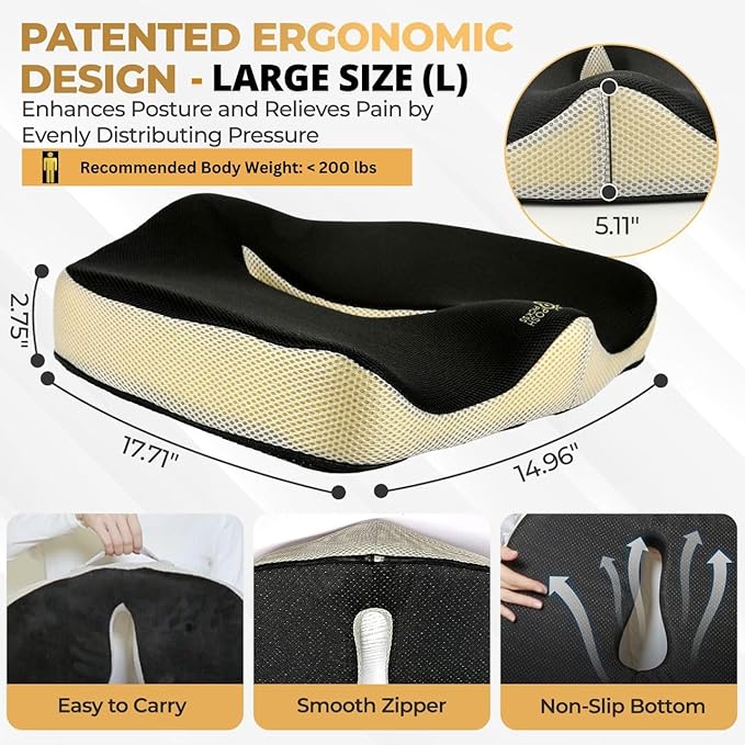 Patented 55D Memory Foam Seat Cushion– Ergonomic Office Chair Cushion for Sciatica Relief, Car Seat Cushion for Long Driving – Coccyx Pillow for Tailbone Pain, Pressure Relief for Hip, All Day Comfort
