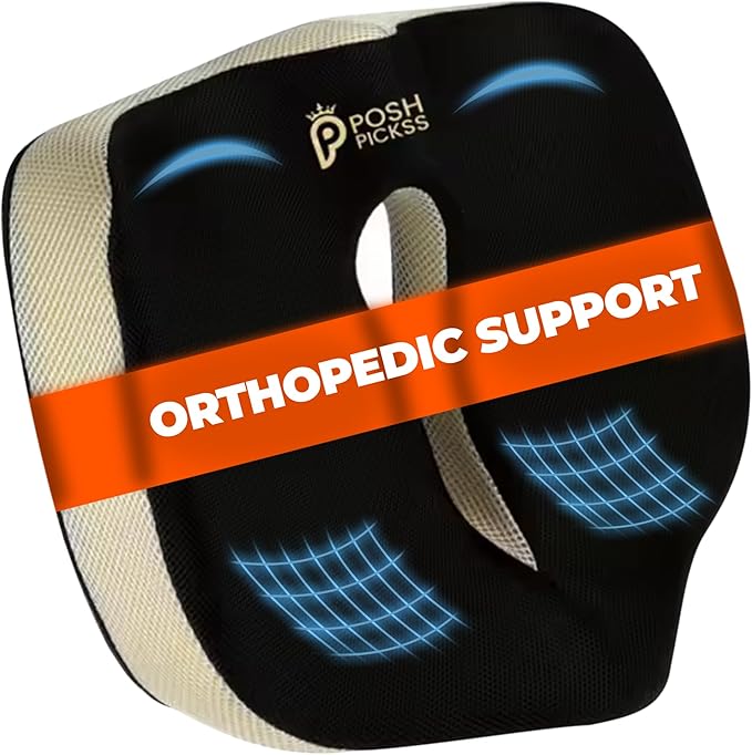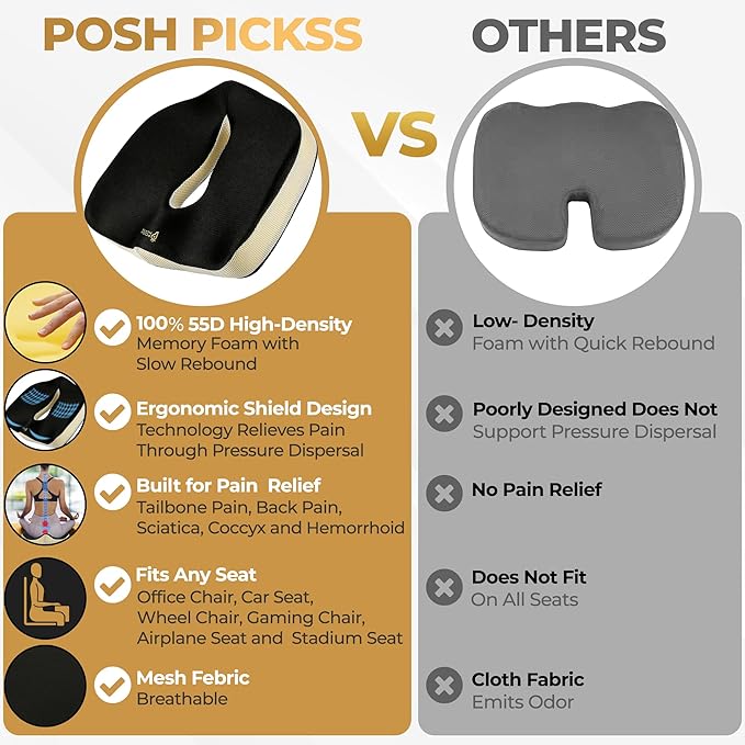 - Hemorrhoid, Tailbone, Lower Back, Coccyx & Sciatica Pain Relief: The ergonomic "Shield" shape seat cushion supports & reduces pressure points on the tailbone, lower back, and hips, helping to relieve hemorrhoid pain, sciatica pain relief, hip & leg pain, coccyx discomfort, pregnancy and postpartum pain, herniated disc relief and support post-surgery recovery. Our seat cushions for office chairs, cushions for kitchen chairs & home ensure optimal comfort and support, which is ideal for promoting healthy posture, supporting spine alignment, and pain relief.
