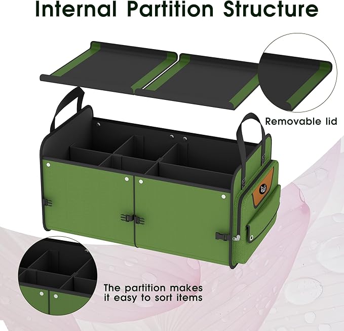 Foldable Waterproof Car Organizer with Non-Slip Traction Rope, 23.2”x13.8”x11.8” Heavy-Duty Trunk Organizer for SUV, Car Essentials List, Portable Vehicle Organizer,GREEN-M003
