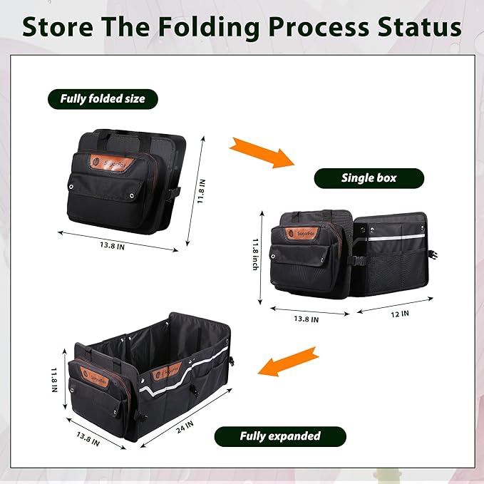 - Structural Design:The car storage organizer offers a 70L dual-compartment system (23.2"×13.8"×11.8") with adjustable dividers for versatile organization. A detachable mesh top expands vertically to store tall items like wine bottles, while its collapsible design folds to 3 inches when empty, optimizing space efficiency in your SUV trunk organizer.
