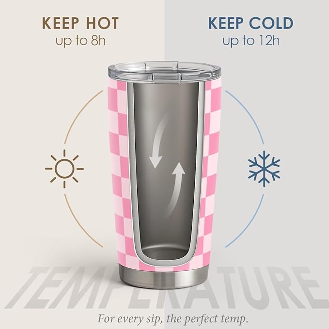Checkered Tumbler 20oz Stainless Steel Insulated, Checker Travel Coffee Cup, Bow Gifts for Women Girls Teen, Birthday Christmas (Pink)