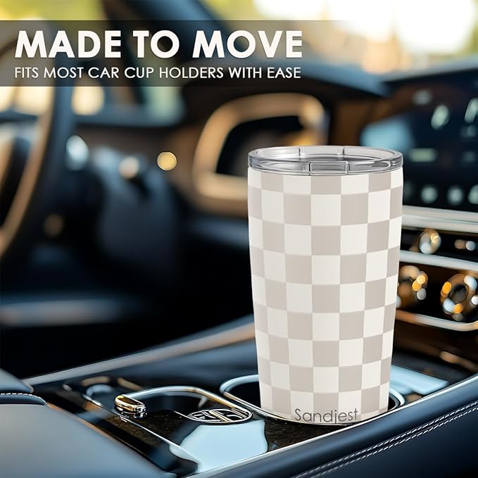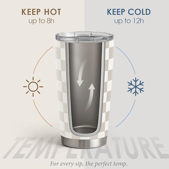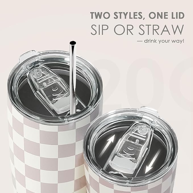 Checkered Tumbler 20oz Stainless Steel Insulated, Checker Travel Coffee Cup, Bow Gifts for Women Girls Teen, Birthday Christmas (Beige)