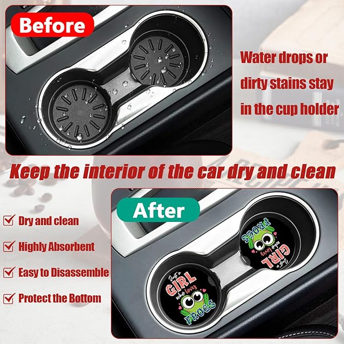 Frog Car Coasters for Cup Holders, Frog Lover Absorbent Ceramic Car Coaster Car Cup Holder Coaster Car Accessories for Women Men (2 Pack)