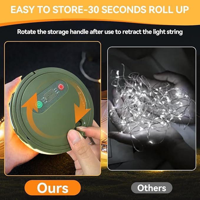 - Ultra-Portable with Smart Storage: Weighing just 7.6 ounces, our camping light features a revolutionary retractable system that effortlessly winds 32.8 feet of string lights in 30 seconds. The space-saving design fits perfectly in backpacks or gear bags, making it a must-have essential for all camping adventures.