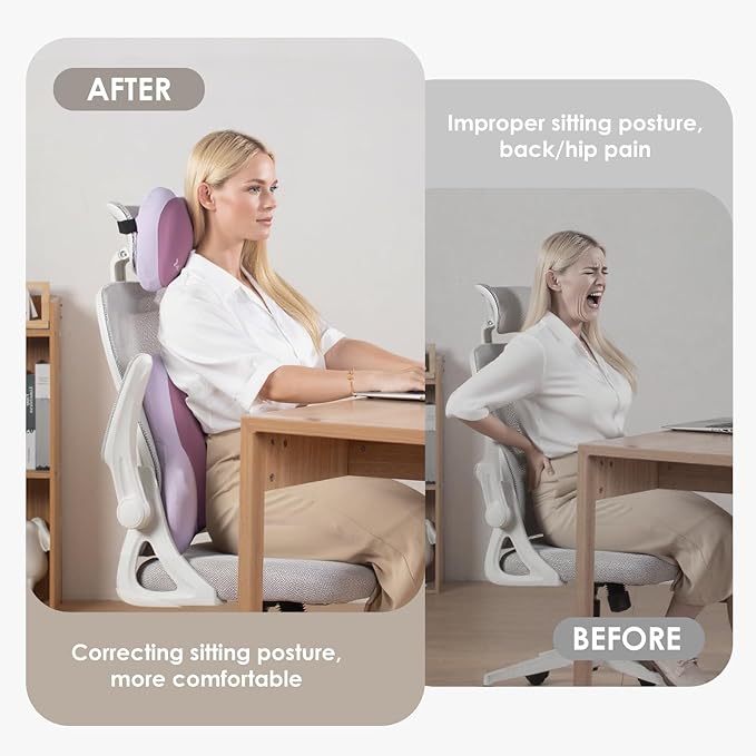 - Upgraded Silicone Memory Foam for Lasting Comfort: Made from soft, supportive dual memory cotton, our back support cushion offers a perfect balance of comfort and firmness. Our office seat cushion features a 3D contoured design that evenly distributes pressure on the hips and legs, alleviating discomfort. It retains its shape without flattening over time, ensuring a cozy experience and support whether you’re working at your desk or taking a long drive.