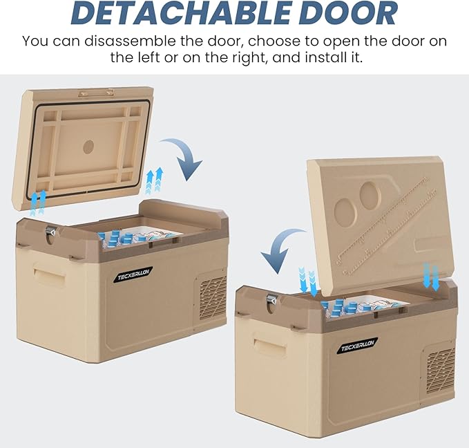 - 【Portable & Easy Access with Removable Door】The door of this car fridge is removable and can be repositioned according to your needs, making it more convenient for you to access your food and drinks while driving. This feature adds versatility, especially when you need quick access on the road or at a campsite.