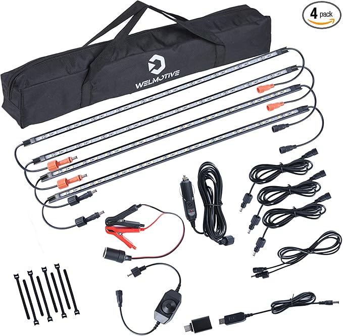 - 【Plug-and-Play Versatility】 (12V, 6W/Bar, 24W Total)Low-power design (0.5A per bar @12V) with 4 power options : 3m cigarette lighter cable (for vehicles), Alligator clips (direct battery hookup), USB connector and Type-C adapter, which can be easily connected to any power source.Dimmable knob switch (adjust brightness on demand).