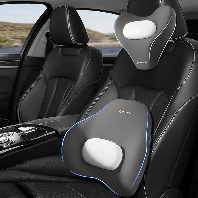 Car Lumbar Support Pillow and Neck Pillow kit for Back & Neck Pain Relief Ergonomic Memory Foam Car Seat Headrest & Lumbar Cushion with Adjustable Strap for Driving Seat/Office Chair Grey
