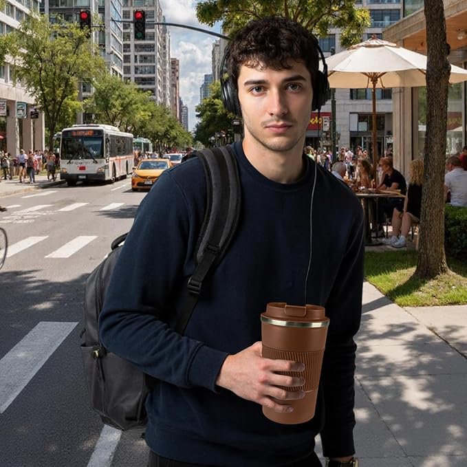 YINBAOGE Insulated Travel Coffee Mug, Spill & Leak Proof, Portable To Go Camping Stainless Steel Coffee Tumbler, Reusable Thermal Coffee Cup with Lid for Hot & Cold Drinks (Brown, 17 OZ)