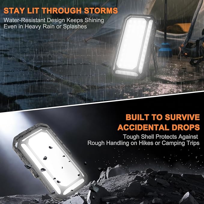 - 【Rainproof & Adventure-Ready Design】 ✓ Tough and Dependable: Handles rain, mud, and accidental drops. ✓ 360° Hooks + Adjustable Stand: Hang from tents, backpacks, or attach to tripods for perfect lighting angles.