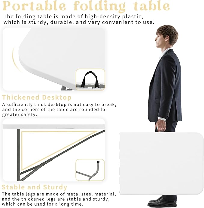 - Multi Functional Outdoor Table:The surface of this folding table is smooth and sturdy, easy to wipe, and the table corners are designed with rounded corners for safety and reliability. The anti slip covers on the four table legs prevent the table from shaking freely and protect the floor from scratches. Each table can accommodate 4-10 people, making it the best choice for outdoor camping, indoor activities, picnics, offices, birthday parties, banquets, weddings, craft fairs, kitchen table, and other events.