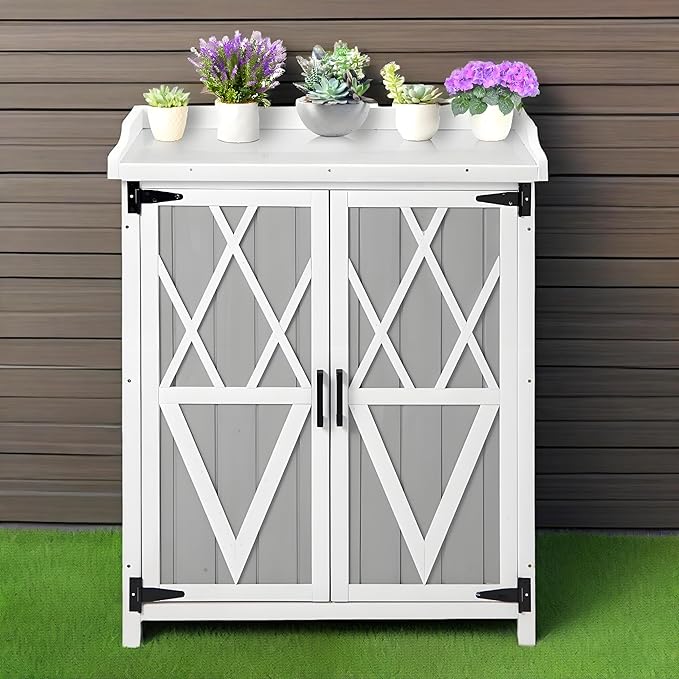 Outdoor Cabinet with Metal Tabletop Garden Potting Bench Table - Outdoor Garden Patio Wooden Storage Cabinet with Adjustable Shelf, Wooden Storage Cabinets, Weatherproof for Garden Patio Lawn