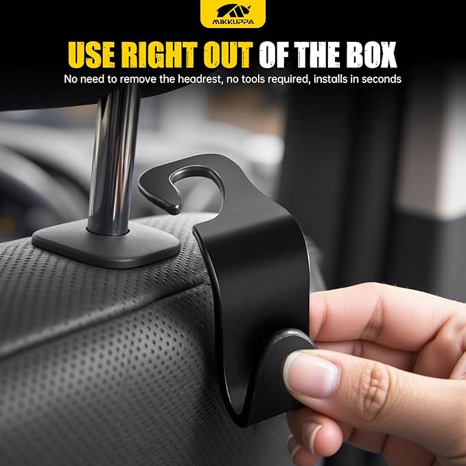 - [INSTANTLY ADDS STORAGE SPACE]: Installing this car storage hook is a breeze, no need to remove the headrest, no tools required. It’s ready to use right after setup, and you can do it one-handed. As a handy car organizer, it turns your headrest into extra in-car storage space. Use it for wallets, backpacks, groceries, handbags, umbrellas, water bottles, shopping bags—you name it. (Fits headrest posts with a diameter of 0.32-0.55 inches)