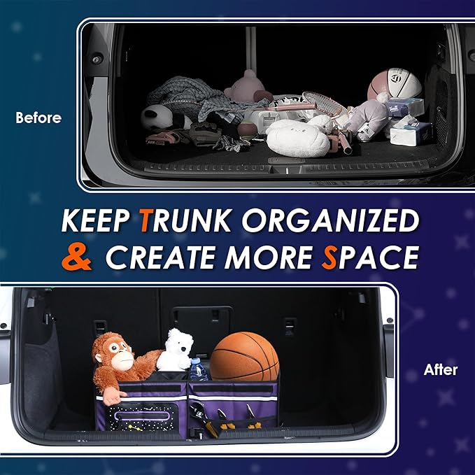 Car Trunk Organizer & Storage | 63L Capacity, 23.6"×13.8"×11.8" | Fluorescent Constellation Design | Waterproof, Collapsible with Adjustable Straps | for SUV, Small/Midsize Cars - Purple-M004