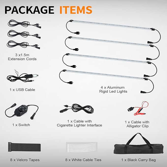 - 【COMPLETE PORTABLE SET】4 x 22-inch 12v led light, 1 x cigarette lighter plug connector cable, 1 x battery clip connector cable, 1 x dimmer switch, 1 x USB connector cable, 1 x TYPE-C adapter, 8 x Velcro fasteners, 3 x extension cables, 1 x portable bag