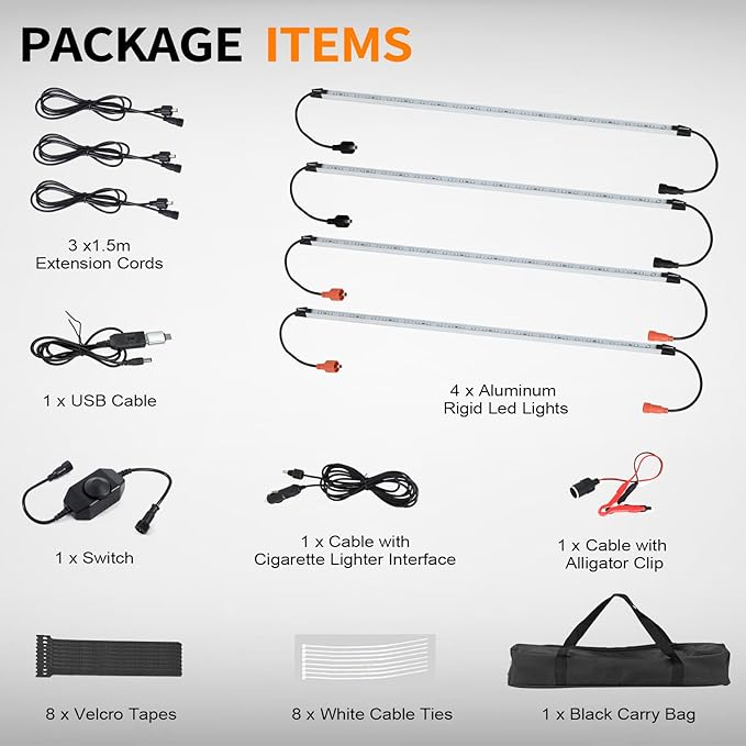 - 【COMPLETE PORTABLE SET】4 x 22-inch 12v led light, 1 x cigarette lighter plug connector cable, 1 x battery clip connector cable, 1 x dimmer switch, 1 x USB connector cable, 1 x TYPE-C adapter, 8 x Velcro fasteners, 3 x extension cables, 1 x portable bag