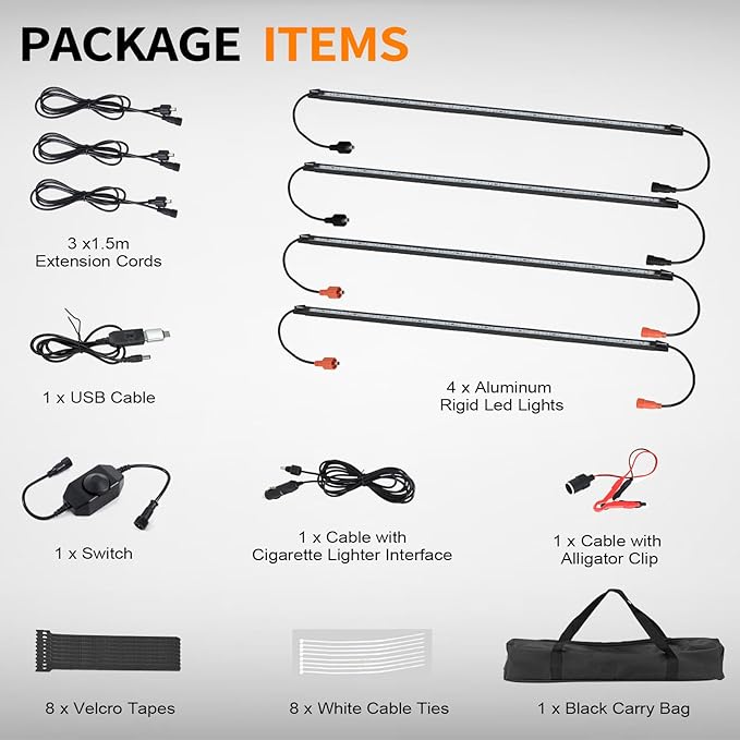 - 【COMPLETE PORTABLE SET】4 x 22-inch 12v led light, 1 x cigarette lighter plug connector cable, 1 x battery clip connector cable, 1 x dimmer switch, 1 x USB connector cable, 1 x TYPE-C adapter, 8 x Velcro fasteners, 3 x extension cables, 1 x portable bag