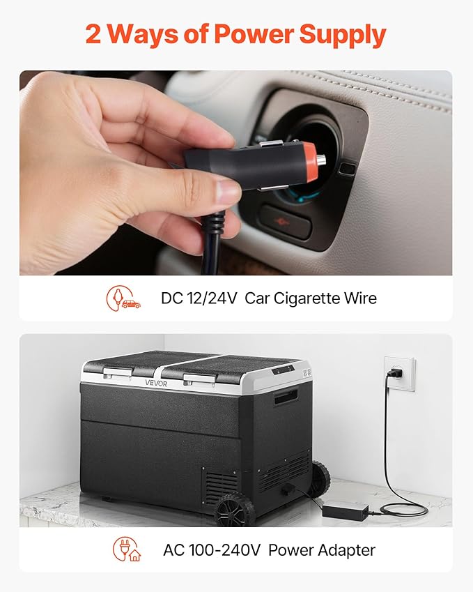 - Dual Use for Home and Car: The portable refrigerator is equipped with an AC 100-240V power cord, DC 12/24V car cigarette wire, and adapter, allowing easy connection to your car/RV’s cigarette lighter port, household outlets, and other power sources