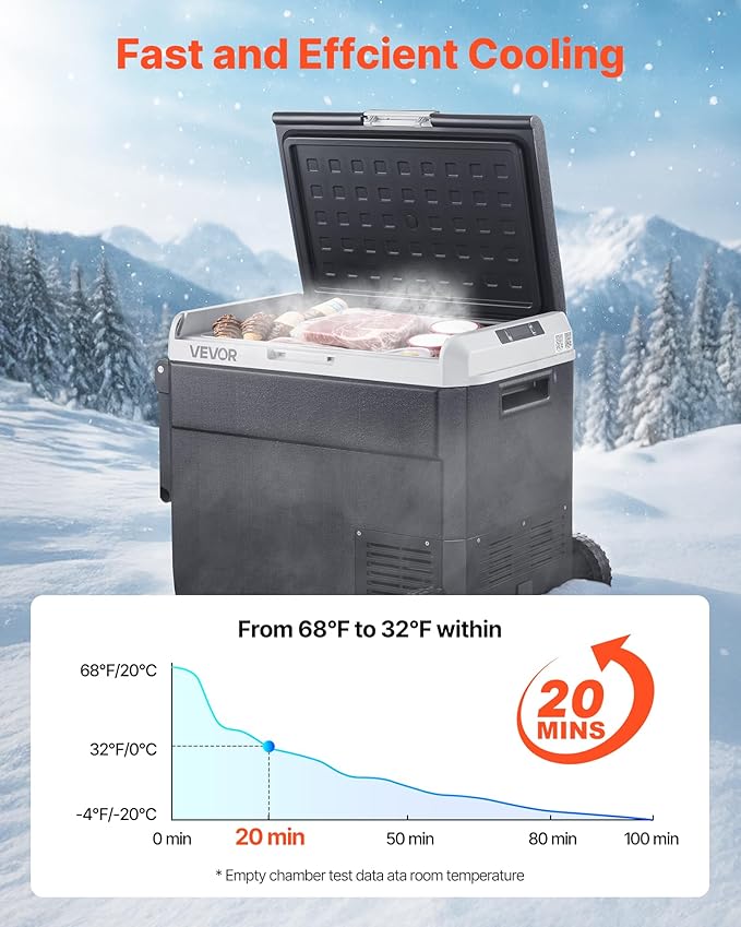- Rapid Cooling: Experience quick and efficient cooling with our car fridge. Equipped with an upgraded compressor, it can cool from 68°F to 32°F in just 20 mins, and cool to -4℉ in 80 mins, ensuring your beverages and food stay refreshingly chilled