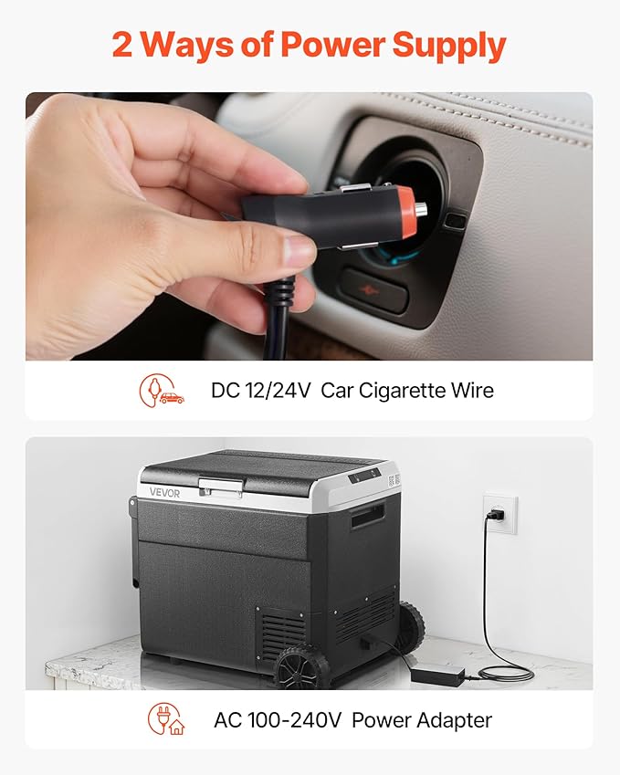 - Dual Use for Home and Car: The portable refrigerator is equipped with an AC 100-240V power cord, DC 12/24V car cigarette wire, and adapter, allowing easy connection to your car/RV’s cigarette lighter port, household outlets, and other power sources